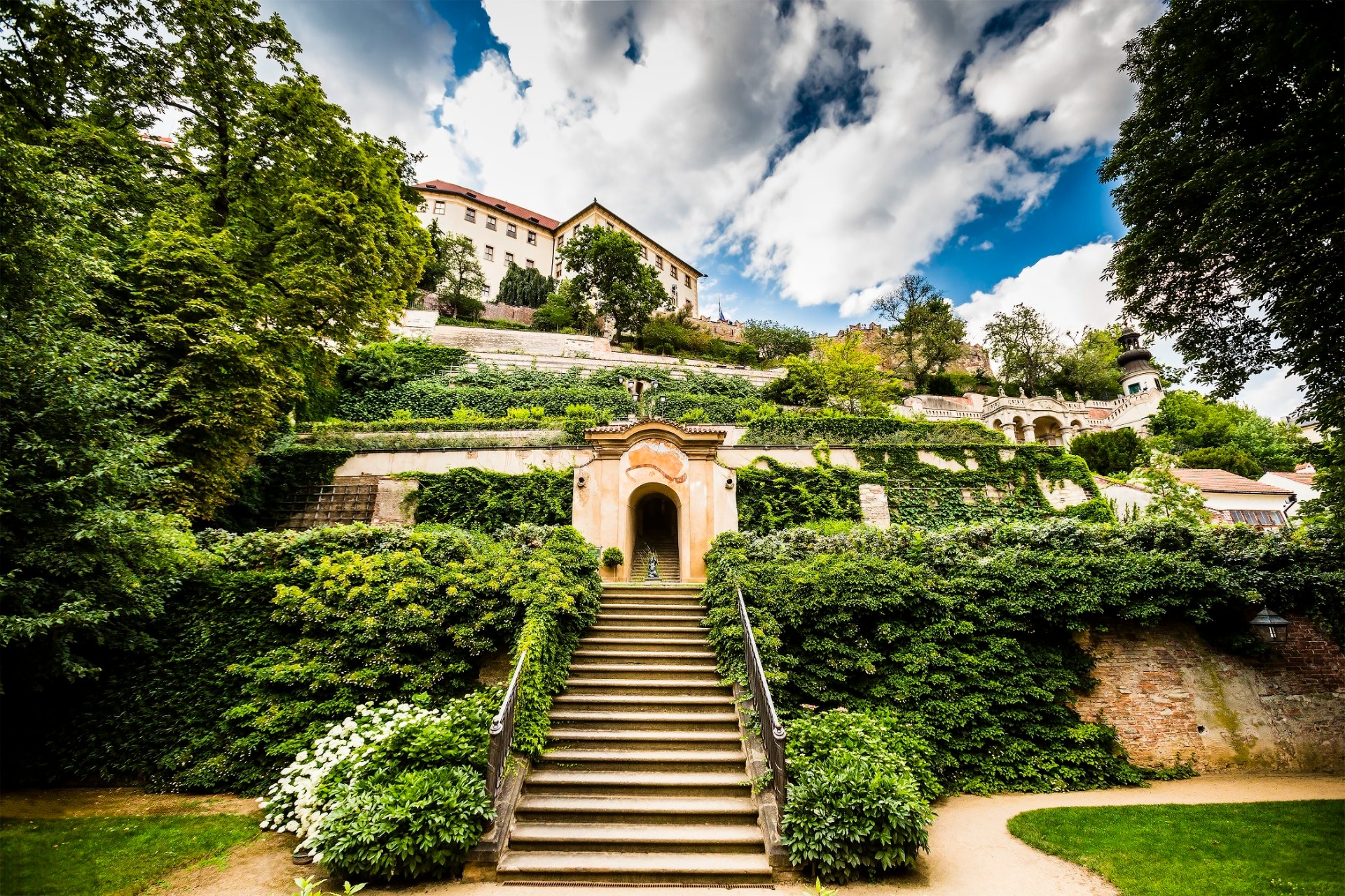 Komplex barokních terasových zahrad s fontánami, sochami a kouzelným výhledem na střechy historické Prahy – ideální pro letní obřady.