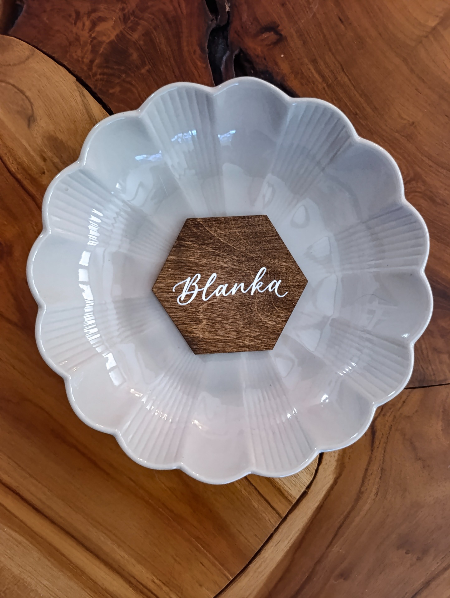 Jmenovka z dřevěné překližky ošetřená nátěrem v odstínu palisandr, rozměr 7,5cm, tloušťka 3mm. Balíček obsahuje 10ks.