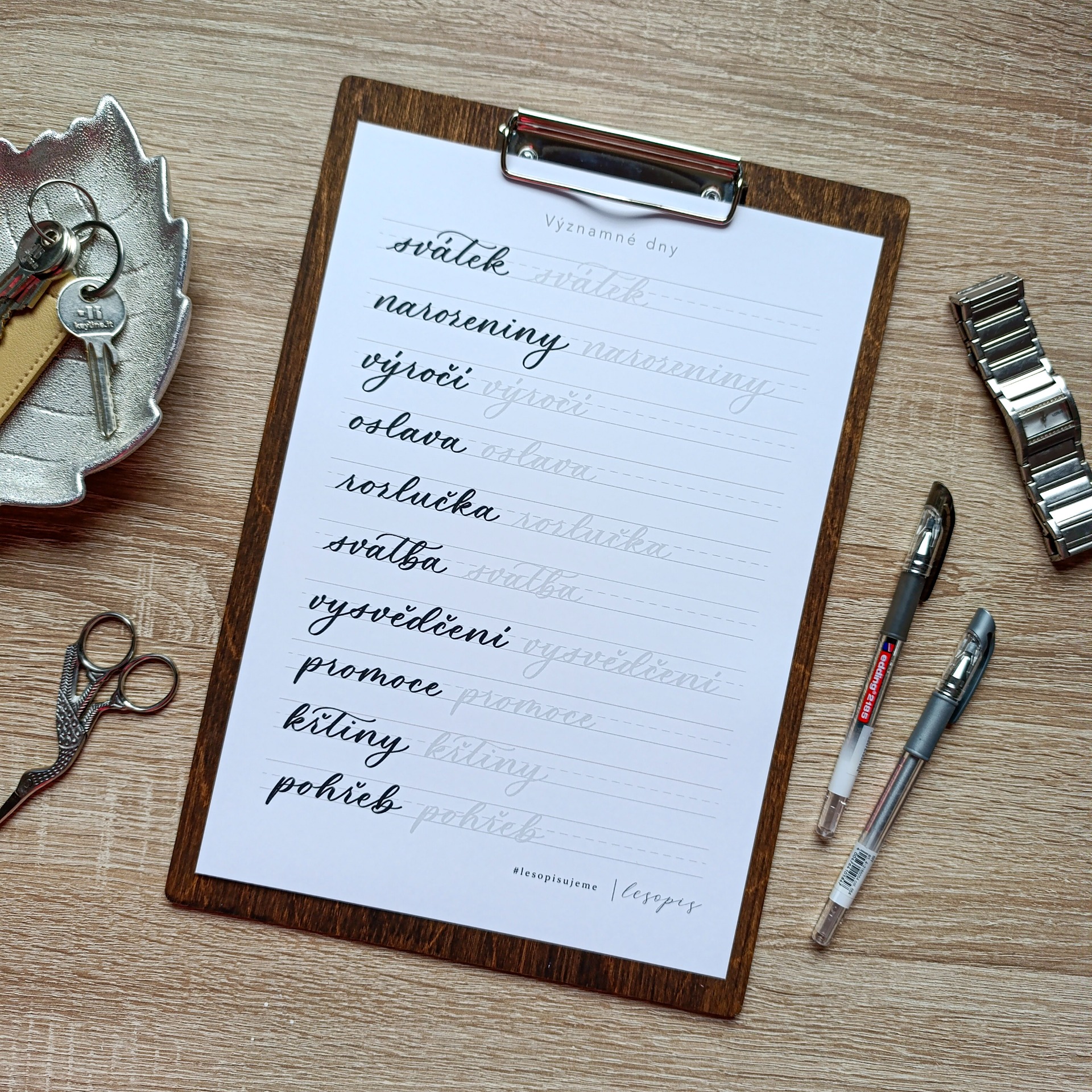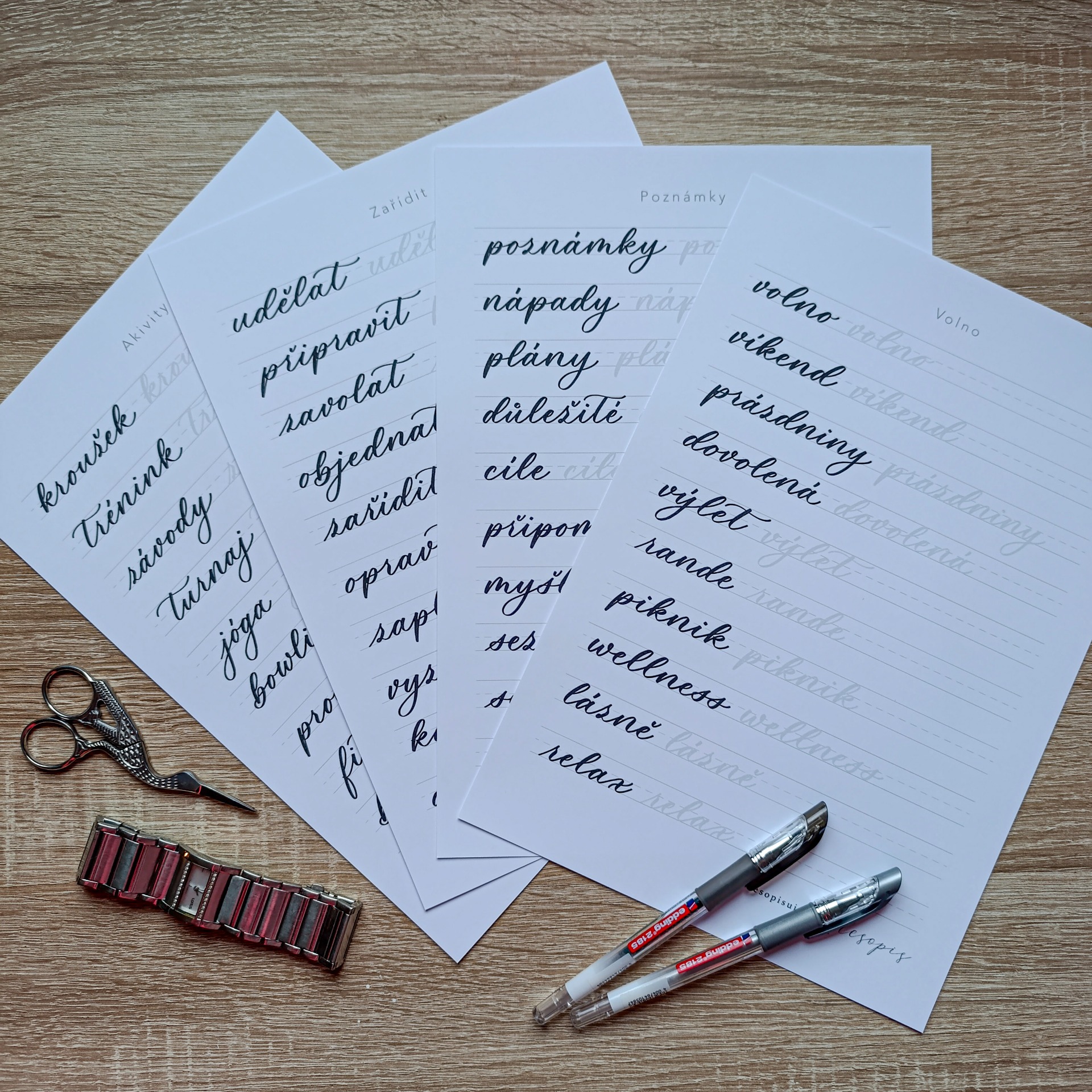 Uvnitř najdeš dny v týdnu, měsíce, běžné denní činnosti i slovíčka z oblastí jako škola, práce, domácnost, kultura nebo dovolená. Nechybí ani stránka praktických slov, jako je vyřídit, nakoupit, poslat, a také drobná slovíčka pro pochůzky, která v plánování běžně používáš. Kromě textů písanka obsahuje i jednoduché piktogramy, kytičky, vlaječky a rámečky, které můžeš využít pro zdobení zápisků nebo tvorbu vlastních nadpisů.
